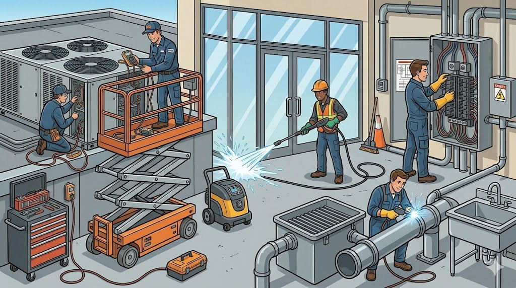 Plumbing Services: Ensure your business stays operational with our comprehensive plumbing services, covering repairs, maintenance, and new installations.